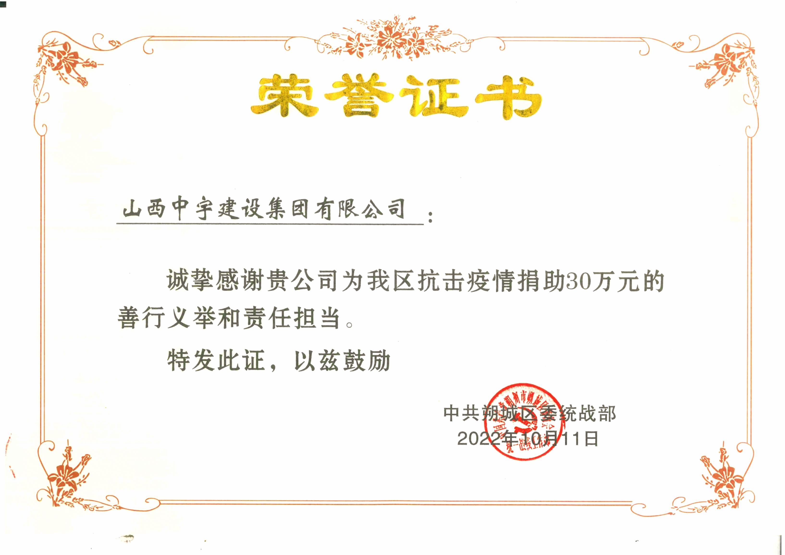 2022年捐助紅十字會(huì)30萬(wàn)元榮譽(yù)證書